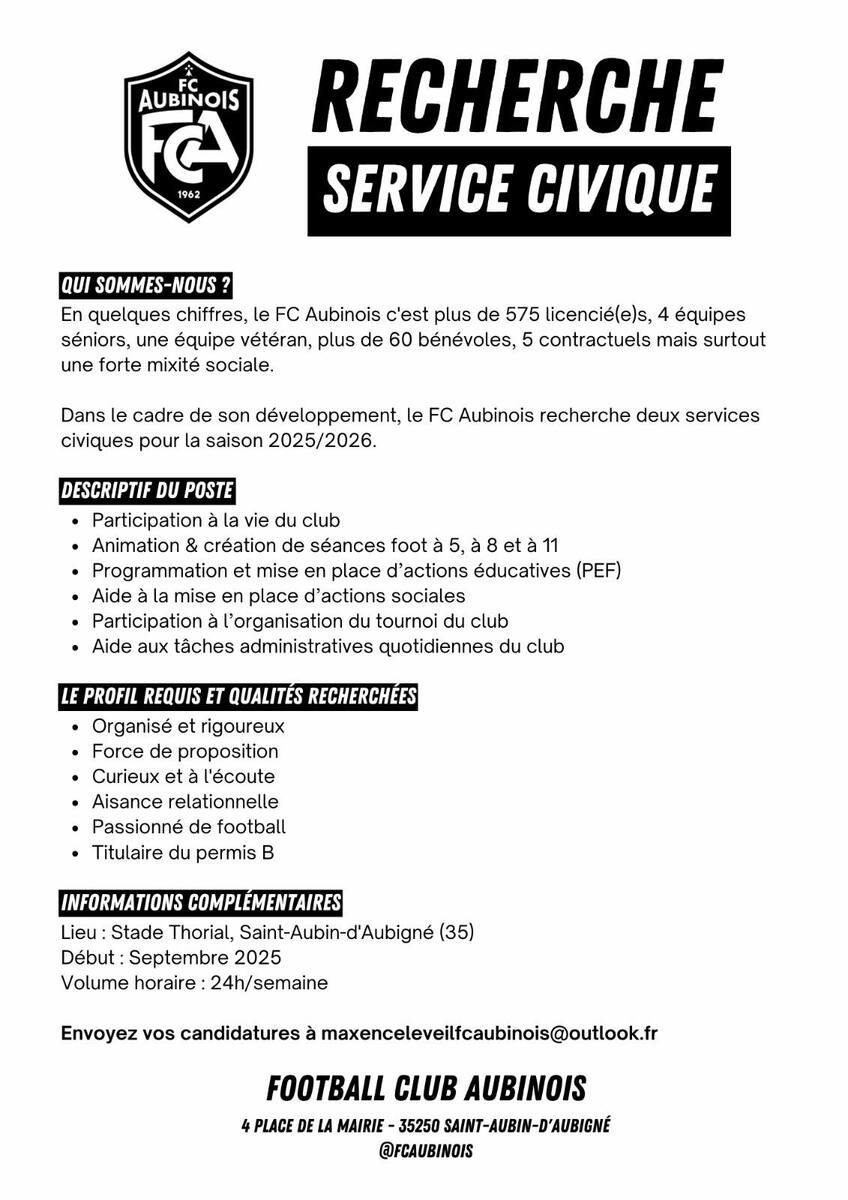 Candidatures à envoyer à : maxenceleveilfcaubinois@outlook.fr